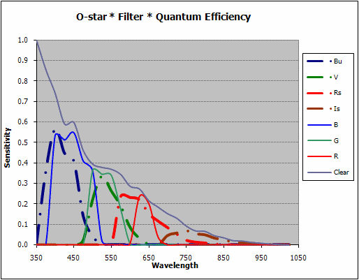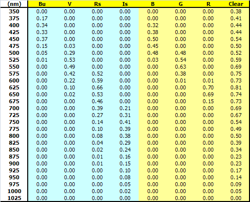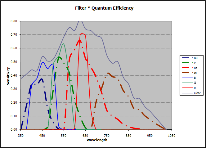 Combining the Data How these data are combined is what gives us the interesting insight into what should be expected out of a filter-CCD system. Multiplying each value in the second column from each row of the table above (Qe) across the row results in the table below. This provides an estimate of the combined response function of the filter-CCD system as a whole, as a function of wavelength. These results are also shown in the graphic below the table. TABLE II.