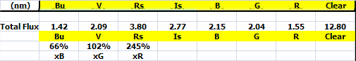 Using the table above in "Combining the Data" and summing down each column gives the following table. In this table the row called "Total Flux" compares in a relative way the light gathering power of this particular filter-CCD combination. So for this system, disregarding the Clear filter which will always take in more light, the Rs filter has the biggest "window." Taking the ratio of Rs to R gives 3.80/1.55 = 2.45, which is approximately equivalent to one magnitude difference, as mentioned above. Thus, imaging throught the Rs filter will reach one magnitude fainter than imaging through the R filter, other things being equal (which they're not!). When imaging through RGB filters, where the ratios of fluxes are B=2.15 :: G=2.04 :: R=1.55, one can reach the same depth with the same exposure in B and G filters, but must increase the exposure time by an amount equal to ~2.1/1.55, or 1.35x. TABLE III.