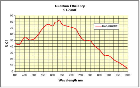 The CCD The third graphic, below, shows the quantum efficiency of one particular detector, the Kodak KAF-0402ME. This graphic illustrates how much of the light at a given wavelength is converted to an electric current. Or notionally more simply, the percentage of incident photons are converted to electrons at a given wavelength.