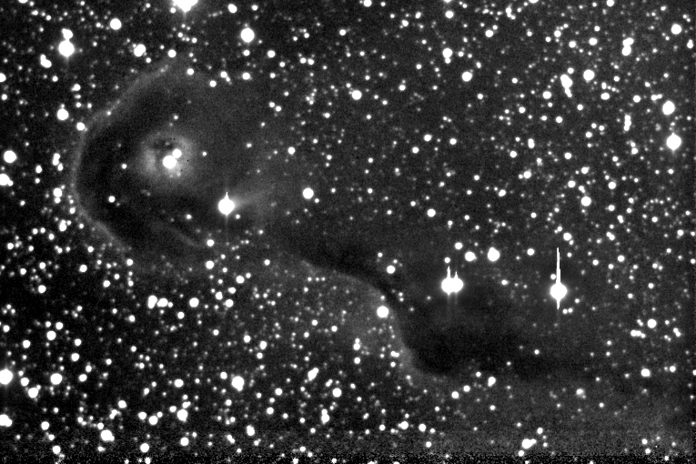 light-years, is a dark globule of dust and non-luminous gas, obscuring the light