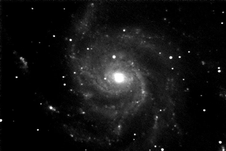 b/w image. M101, also known as the Pinwheel Galaxy, is a spiral (type Sc) located in