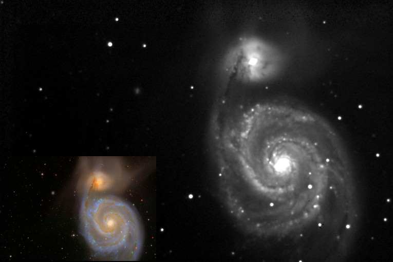 associated with the nearby galaxy, M51 (also known as the Whirlpool Galaxy). This picture combines a