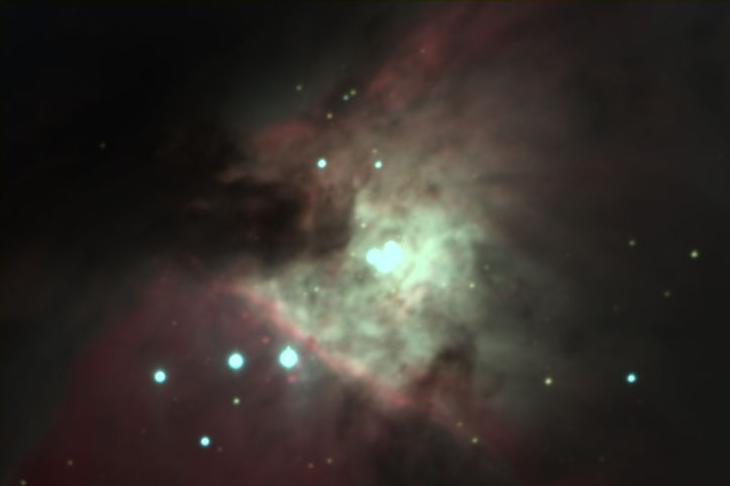 in Blue, V (green), and R (red). Total exposure is 22 minutes. At the distance of the nebula, estimated