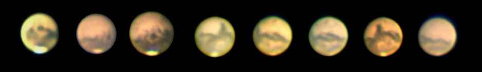 (18-29 Aug 2003) A montage of my best pictures of Mars using a webcam, stacking and processing